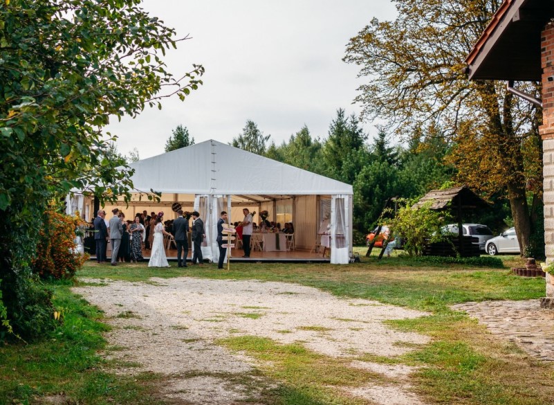 Przyjęcia dla około 40–80 osób organizujemy w eleganckim namiocie ogrodowym od sprawdzonego dostawcy. Może on zostać ustawiony na przygotowanej, równej trawie lub – jeśli wolicie – na drewnianej podłodze. To Wy decydujecie, czy wybieracie stoły okrągłe, czy podłużne. W namiocie znajdzie się również miejsce dla DJ-a oraz bufetu. Nastrojowe oświetlenie i starannie dobrane dekoracje dopełnią klimatu, a widok sielskich pól i kojącej zieleni sprawi, że goście w pełni poczują atmosferę rustykalnego, naturalnego wesela. Namiot stoi na tyle daleko, by prezentował się okazale, a jednocześnie na tyle blisko domu i stodoły, że goście nie zdzierają podeszw na pokonywaniu dystansu między nimi – tylko na parkiecie!